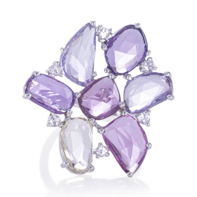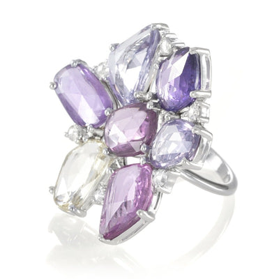Détails : bague en or blanc 18Kt, sertie de 7 saphirs naturels, d'un poids total de 12,63 carats, et de 6 diamants taille rose (0,20 carat).